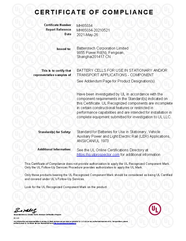 国庆将至,上海兰钧新能源科技有限公司又传来好消息,其LFP-50Ah、LFP-70Ah及LFP-280Ah电芯在通过UL1973电池安全测试并取得UL颁发的证书后,又顺利通过了IEC62619电池安全测试,满足了美国(UL)及欧洲国际电工委员会(IEC)所制定的相应标准以及技术要求;与此同时,LFP-280Ah电芯也通过了UL9540A测试并取得相应报告。加上之前通过的国家标准GB 38031,GB/T 31484和GB/T 31486的检测,这意味着50Ah、70Ah及280Ah型号的电芯均已获得中国、美国、欧盟等主要国际市场严苛标准的检验认可,也代表兰钧新能源已获得供应国内市场的资质及通往欧美国家的通行证。此外,LFP-50Ah和LFP-70Ah两款电芯的UL9540A测试及280Ah GB/T 36276测试已完成送样,目前正在测试机构进行认证。