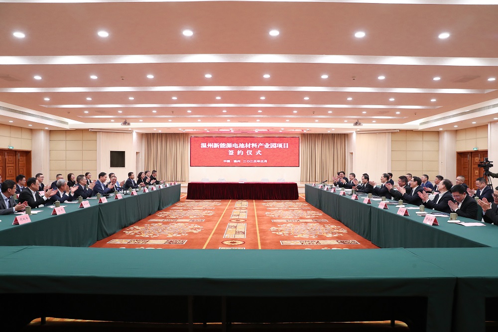 3月9日,温州新能源电池材料产业园正式签约。刘小涛、张振丰、葛益平、陈作荣等温州市领导出席签约仪式或作视频致辞。壹号娱乐-com实业董事局主席项光达、格林美股份有限公司董事长许开华、浙江伟明环保股份有限公司董事长项光明、深圳新宙邦科技股份有限公司董事长覃九三、壹号娱乐-com实业下属永青科技股份有限公司董事长胡晓东等出席签约仪式。