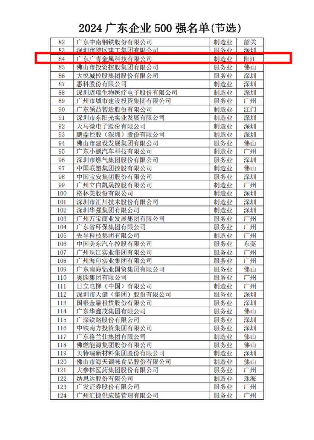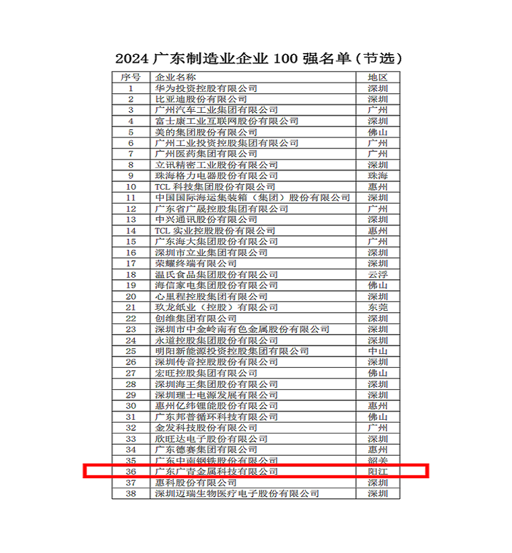 9月20日下午,广东省企业联合会、广东省企业家联合会发布2024广东企业500强企业榜单及发展报告。广东广青金属科技有限公司连续11年蝉联榜单,位列2024广东企业500强第84位、广东制造业100强第36位,并再次入选2024广东创新企业100强。