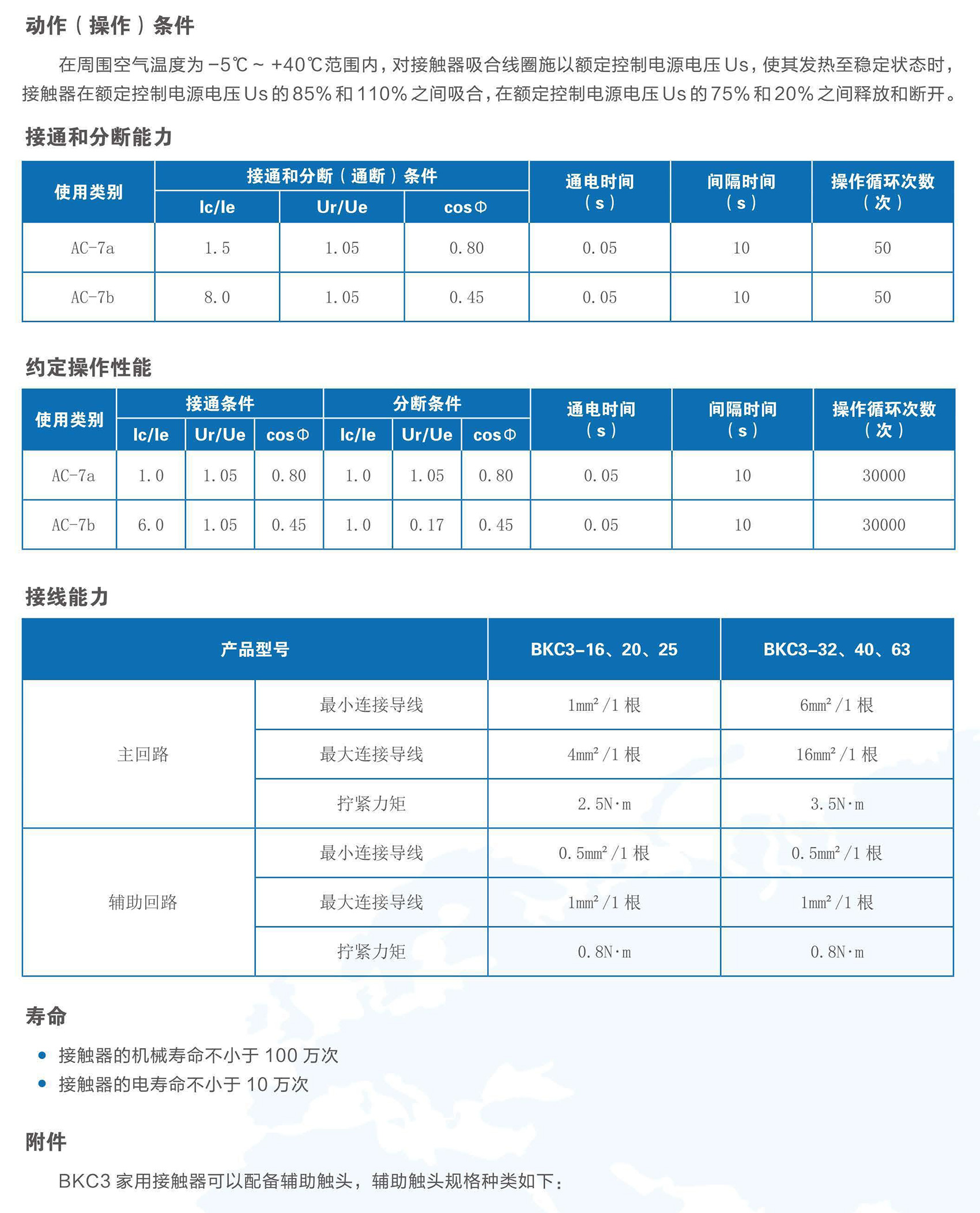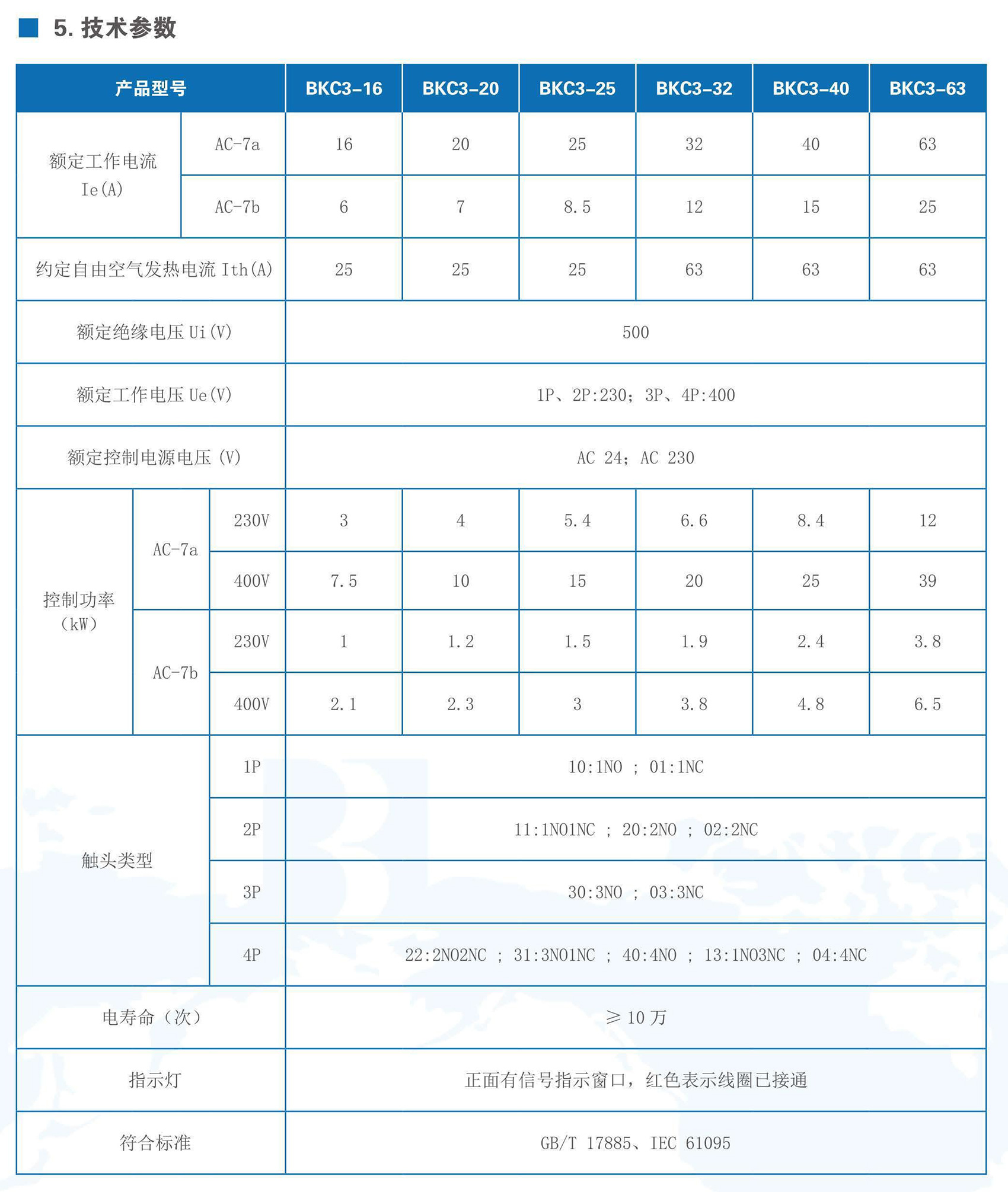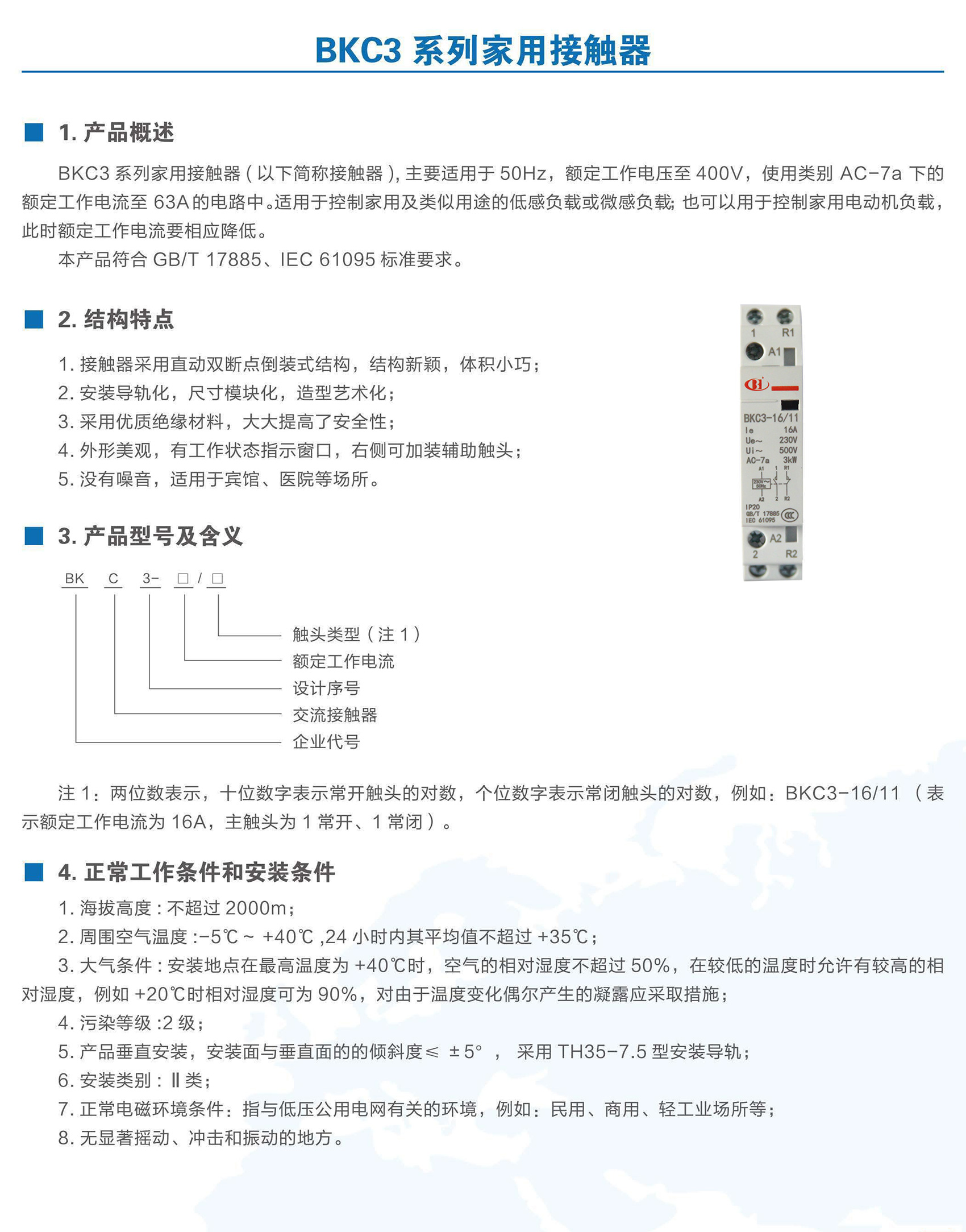 BKC3系列家用接触器适用于交流50Hz,额定工作电压至400V,使用类别 AC-7a下的额定工作电流至63A,用于控制家用及类似用途的低感或微感负载,也可以用于控制家用电动机负载。本产品应用于宾馆、公寓等场所,实现自动化控制功能。产品符合GB/T 17885、IEC 61095标准。